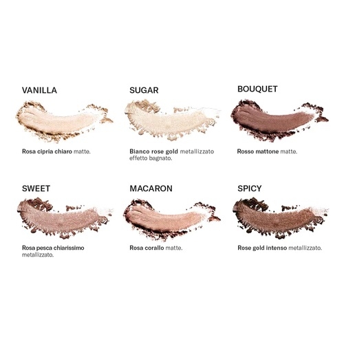 Palette dalle texture innovative, burrose, dai finish opachi, metallizzati e luminosi si mescolano assieme per poter creare qualsiasi tipi di look sulle tonalità del rosa caldo e delle perlescenze rose gold, sia più chiare che intense.