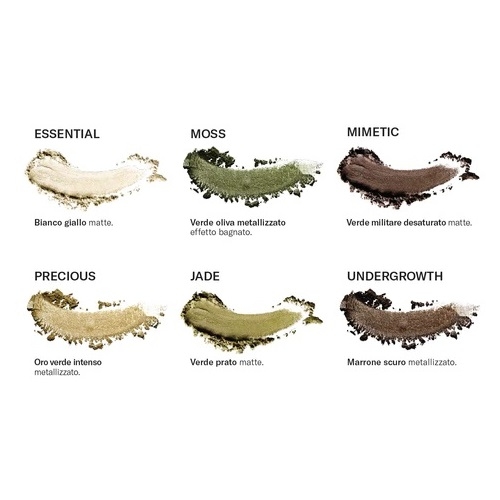 Per realizzare un look sfumato e allungato preleva Jade e con il pennello morbido E01/E02 sfumalo nella piega dell’occhio, successivamente con Mimetic e il pennello angolato E08 traccia una linea di eyeliner sfumato seguendo la rima cigliare superiore. Essential con il pennello a setole piatte E03/E04 per sfumare i bordi verso l’esterno dell’occhio. Moss, Precious e Undergrowth possono essere utilizzati al centro della palpebra come punto luce, o all’inizio del dotto lacrimale. Queste tonalità sono valorizzate al massimo se applicate direttamente con il polpastrello.