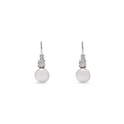 Orecchino in acciaio di medie dimensioni con zirconi e perla pendente. Raffinato, elegante, formale.