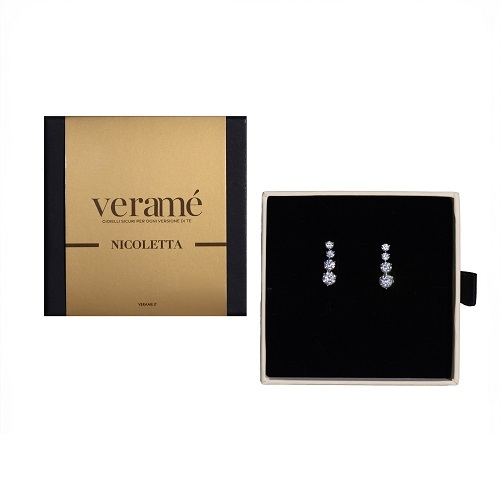 Orecchino pendente con zirconi incastonati. Dinamico, brillante, elegante.