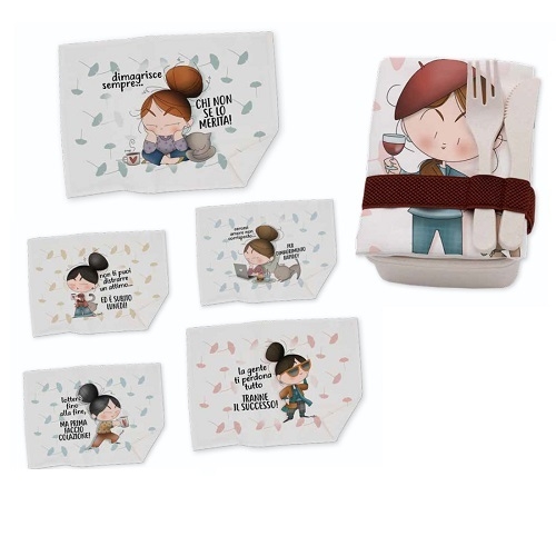 Contenitore in fibra di bamboo 16,5 x 11 x 5h cm con fascia elastica completa di posatine + tovaglietta in cotone fiammato stampato 32 x 46 cm