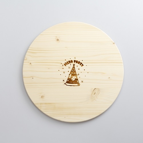Tagliere tondo in legno di abete per la pizza con disegno timbrato.