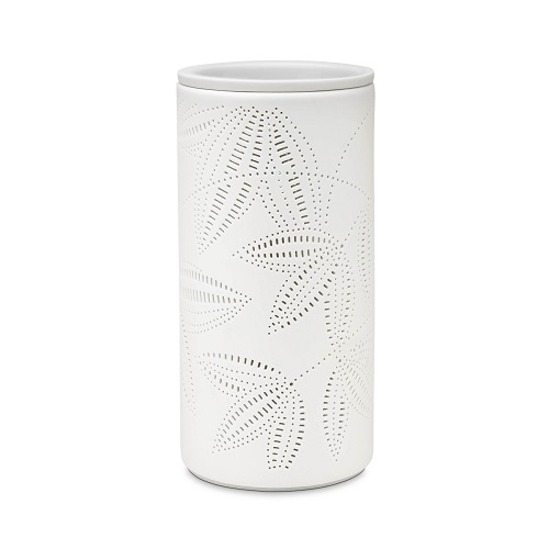 In Tonka esotiche foglie delicatamente traforate impreziosiscono la ceramica dalla quale, una volta acceso il diffusore, si diffondono suggestivi giochi di luce.