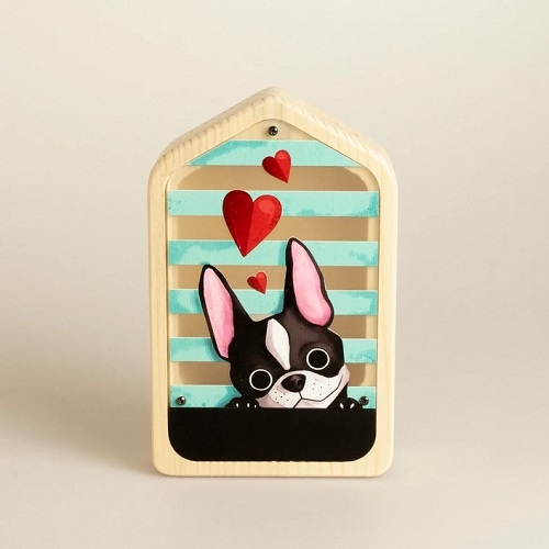 Salvadanaio in legno di abete con pannello stampato in plexiglass opaco.