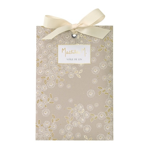 Elegante sacchetto profumato, delicata in tutti i piccoli spazi, come gli armadi, i cassetti, le valigie e le automobili con Voile de Lin, un profumo che non lascia la sensazione poudrée di un mazzo di rose e di violette che si fonde in un leggero muschio bianco bordato de fiori di lino. Una fragranza avvolgente, il souvenir delle note di biancheria propria sciacquate di un bell'armadio antico.