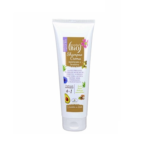 Lo Shampoo-crema nutriente e lenitivo ParentesiBio possiede proprietà ristrutturanti sui capelli e aiuta detergere la cute secca e irritata senza aggredire le lunghezze danneggiate da trattamenti severi come permanenti, colorazioni e decolorazioni.