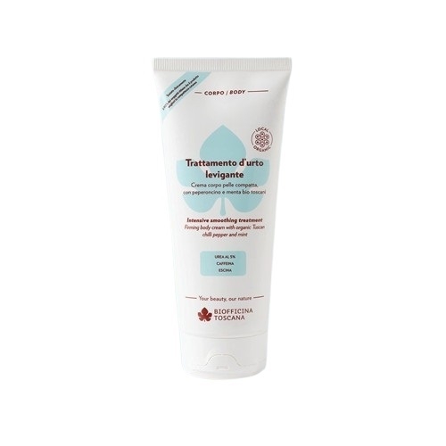 Un trattamento d’urto levigante per il corpo, testato clinicamente con misurazioni strumentali che dimostrano un miglioramento dell’aspetto della pelle già dopo 28 giorni*. Ricco di attivi dalle riconosciute proprietà come l’Urea al 5% per un’azione idratante-levigante, la caffeina con effetto benefico sulla microcircolazione per un miglioramento del tono cutaneo, l’ escina che aiuta a combattere il gonfiore e a mantenere tonici i capillari. Questi attivi sono uniti per un’azione intensa ad oli vegetali tra cui olio di mandorle dolci al 6% con proprietà emollienti-elasticizzanti ed a mirati estratti tonificanti e lenitivi come la centella e la salcerella inserito ad una percentuale funzionale che in studi in vivo ha dimostrato avere un effetto push up sui glutei e modellante sulle cosce. Completano la formula peperoncino e menta bio toscana con il mentolo al 3% per un effetto rinfrescante-decongestionante Riduce visibilmente gli inestetismi cutanei della pelle a buccia di arancia**, legati alla presenza della cellulite, per una pelle più tonica, compatta e liscia***.