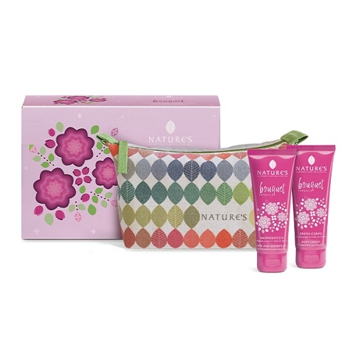 Confezione speciale contenente una Pochette in tessuto 100% riciclato con Bagnodoccia e Crema Corpo Bouquet Fragola