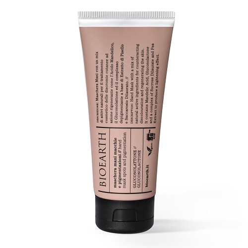 Maschera Mani con un mix di attivi naturali per il trattamento cosmetico delle discromie cutanee ad azione rigenerante come l’Acido Mandelico, il Gluconolattone ed il complesso depigmentante a base di Estratto di Pisello e Saccarosio Dilaurato.