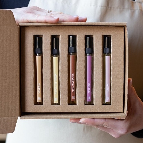“Coccole” è un cofanetto totalmente in cartone con all’interno 5 profumi naturali da 10ml.