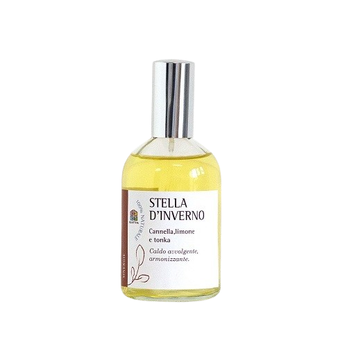 INCI: Alcohol Denat (Alcohol di Grano Bio), Water (Aqua), Olio Essenziale di Cannella (Cinnamomum Verum essential oil), Limone (Citrus Limonum essential oil), Tonka (Dipteryx Odorata essential oil), *Limonene, *Linalool, *Citral, *Geraniol *Presente naturalmente negli oli essenziali.