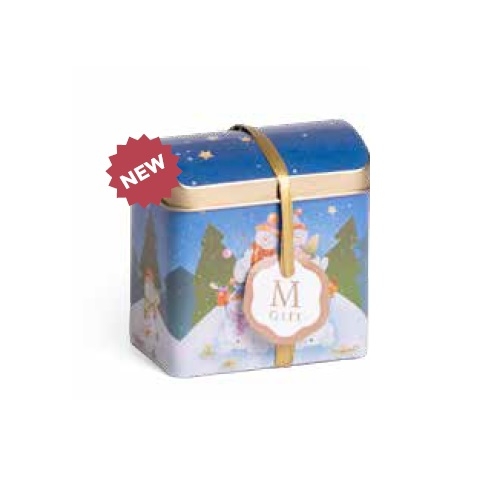 Latta metallica bauletto (5x8x8,5 cm) contenente 1 sacchetto 25g miscela di frutta + 1 vasetto 30g confettura frutta.
