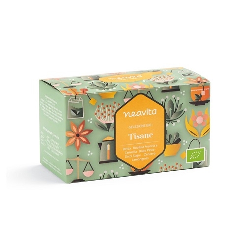 Contiene 4 bustine per tipo di Tisana Detox Bio, Pancia Piatta Bio, Dolci Sogni Bio, Dopo Pasto Bio, Zenzero e Lemongrass Bio.
