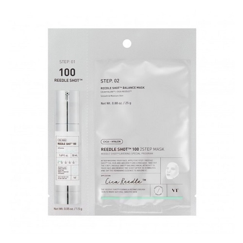 VT Reedle Shot 100 2-Step Mask è un trattamento avanzato in formato due step, pensato per rivitalizzare la pelle e migliorarne l’elasticità fin dalla prima applicazione. Il sistema abbina un concentrato arricchito con micro-aghi, che favoriscono la penetrazione degli attivi, a una maschera in tessuto imbevuta di siero intensivo.
