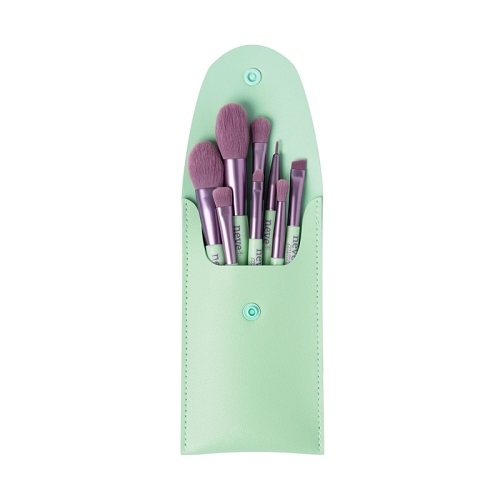 Pastel Pop Vegan Brush Set contiene una pochette in vegan leather verde menta, pratico e resistente e otto pennelli morbidissimi per truccare viso, occhi e labbra senza rinunciare a niente: