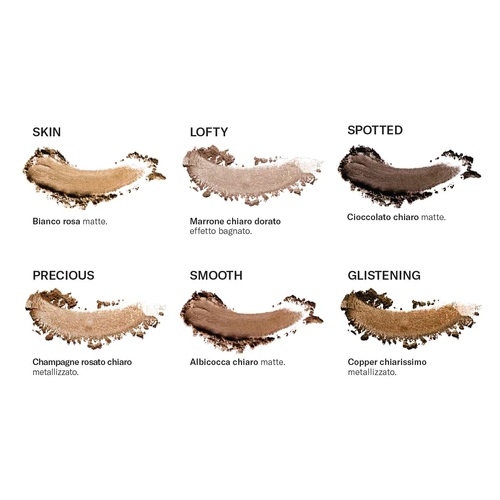 Per realizzare un look sfumato e allungato preleva Smooth e con il pennello morbido E01/E02 sfumalo nella piega dell’occhio, successivamente con Spotted e il pennello angolato E08 traccia una linea di eyeliner sfumato seguendo la rima cigliare superiore. Skin con il pennello a setole piatte E03/E04 per sfumare i bordi verso l’esterno dell’occhio. Lofty, Sweetheart e Glistening possono essere utilizzati al centro della palpebra come punto luce, o all’inizio del dotto lacrimale. Queste tonalità sono valorizzate al massimo se applicate direttamente con il polpastrello.