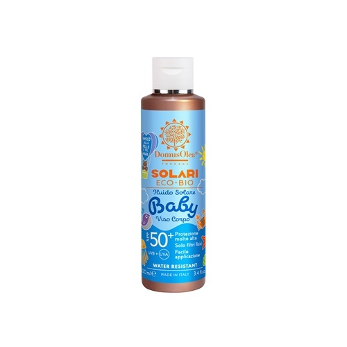 FLUIDO SOLARE PROTEZIONE MOLTO ALTA UVA+UVB SPF 50+ PER BAMBINI E NEONATI 0+, con SOLO FILTRI FISICI, SENZA NANOPARTICELLE, RESISTENTE ALL’ACQUA. Di scorrevole applicazione e rapido assorbimento, non lascia la pelle lucida e non favorisce l’attaccamento della sabbia. Formula arricchita con fitocomplessi esclusivi Domus Olea Toscana di Olivo ed Elicriso, Olii di Girasole, Sesamo, extravergine di Oliva, Mandorle Dolci, Jojoba, Burro di Karité, Vit. C, E, Bisabololo.