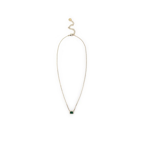Collana sottile con pendente rettangolare impreziosito da zircone verde e contorno di piccoli zirconi chiari.