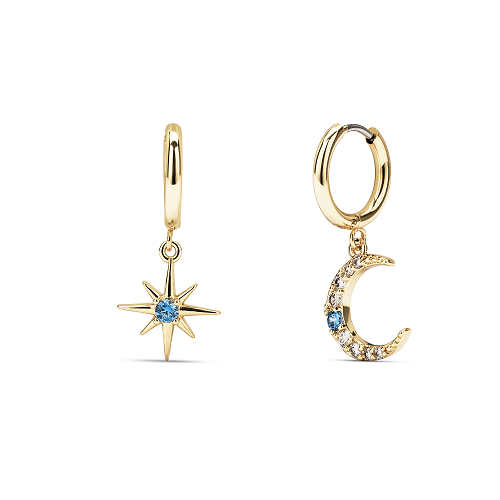 Cerchietto medio con pendenti differenti, stella e luna. Vivace, moderno, giocoso. Chiusura a cerniera.