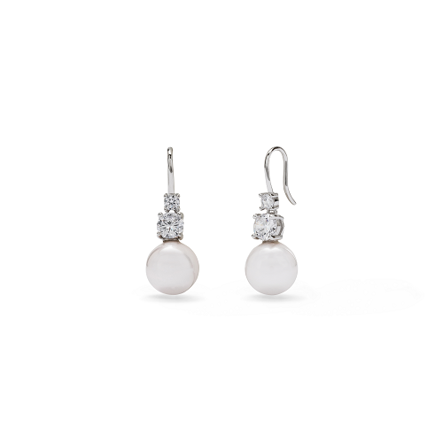 Orecchino in acciaio di medie dimensioni con zirconi e perla pendente. Raffinato, elegante, formale.