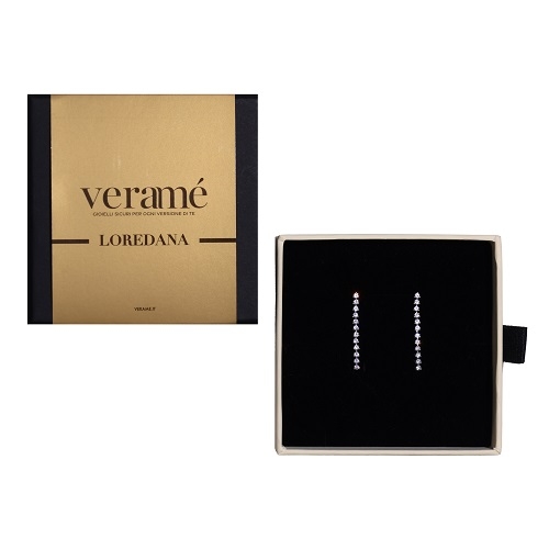 Orecchino pendente con zirconi incastonati. Lungato, simmetrico, luminoso.