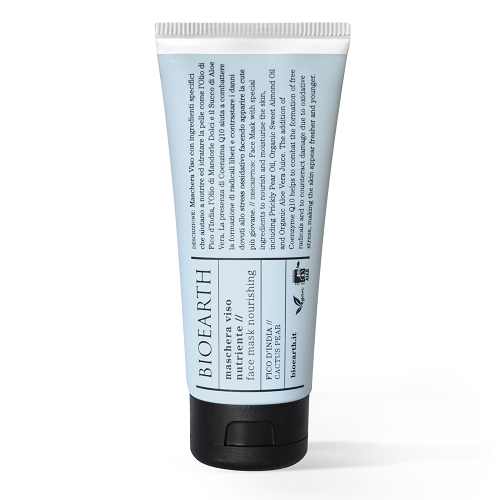 Maschera Viso con ingredienti specifici per nutrire e idratare la pelle come l’Olio di Fico d’India, l’Olio di Mandorle Dolci e il Succo di Aloe Vera. La presenza di Coenzima Q10 aiuta a combattere la formazione di radicali liberi e contrastare i danni dovuti allo stress ossidativo facendo apparire la cute più giovane.