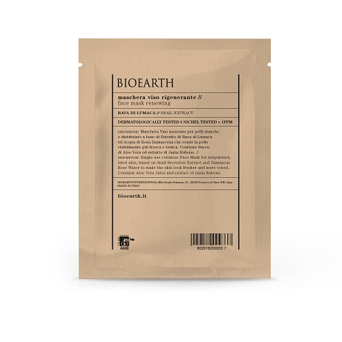 Maschera Viso monouso per pelli stanche e disidratate a base di Estratto di Bava di Lumaca ed Acqua di Rosa Damascena che rende la pelle visibilmente più fresca e tonica. Contiene Succo di Aloe Vera ed estratto di Jania Rubens.