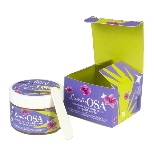 La maschera viso schiarente e uniformante pelle secca della linea LuminOSA è una maschera viso a base di estratto di vite rossa, papaina, bromelina, olio di oliva, estratto di orchidea e maltodrestina, indicata per trattare le macchie brune, le discromie cutanee e riequilibrare il film idrolipidico della pelle secca.