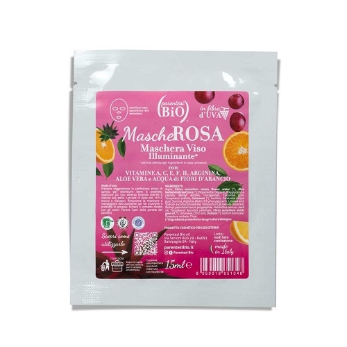 MascheROSA. Maschera viso illuminante ideale per un trattamento cosmetico ricostituente per la pelle. Vitamina A, H, C, E ed F agiscono in sinergia per aiutare a migliorare l’integrità cutanea. L’Arginina, amminoacido essenziale, arricchisce il prodotto apportando idratazione. La pelle appare vivace e morbida.