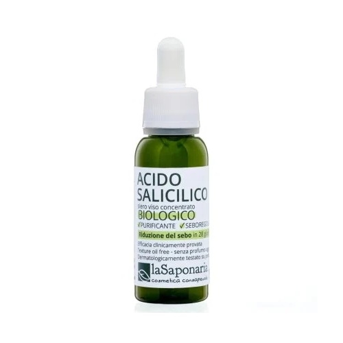 Siero viso concentrato certificato biologico formulato da Acido Salicilico, una molecola dotata di proprietà esfolianti che si rivela particolarmente utile in caso di acne o pelle impura.